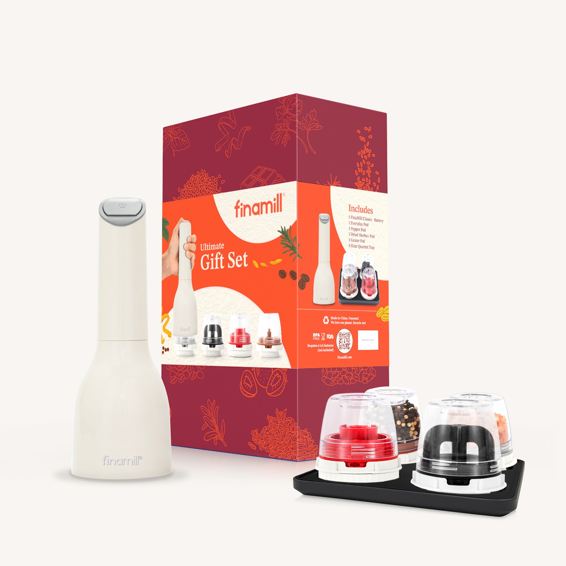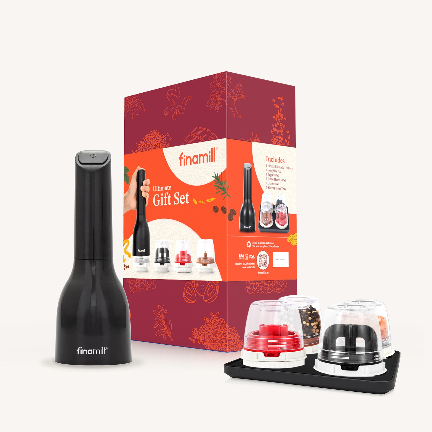 Turn everyday cooking into a flavor-packed adventure with the FinaMill Classic Battery Ultimate Gift Set! This premium, ready-to-gift box set includes the FinaMill Classic Battery spice grinder and four of our most popular, easily swappable FinaMill flavor pods—everything you need to grind fresh whole spices, dried herbs and more effortlessly.